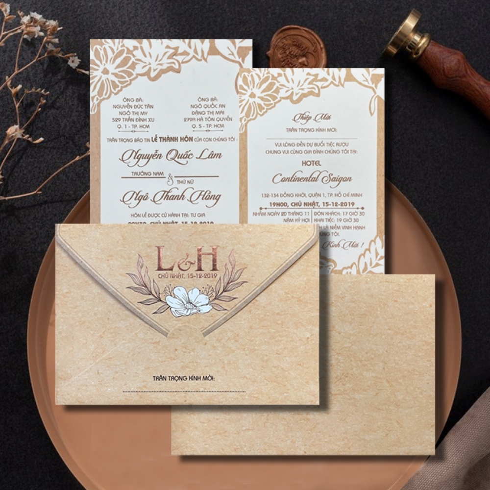 Thiệp cưới sang trọng: Dùng giấy cao cấp, in nổi, hoặc ép kim tăng tính thẩm mỹ.